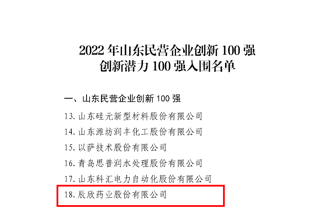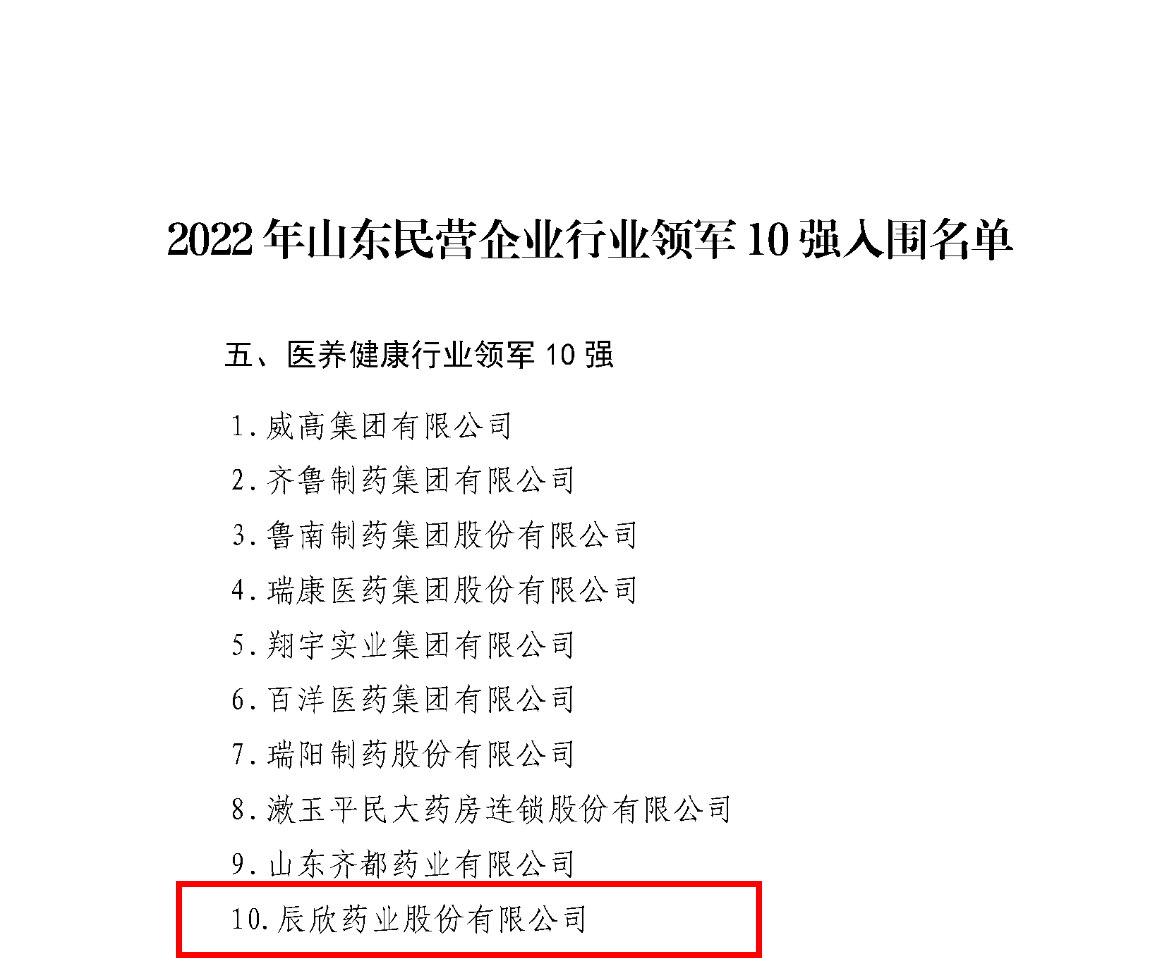 近日,山東省工商聯(lián)網(wǎng)站發(fā)布通告,公示了2022年山東民營企業(yè)行業(yè)領(lǐng)軍10強、創(chuàng)新100強、創(chuàng)新潛力100強、吸納就業(yè)100強入圍名單。辰欣藥業(yè)榮登“醫(yī)養(yǎng)健康行業(yè)領(lǐng)軍十強”及“山東省創(chuàng)新百強企業(yè)”。