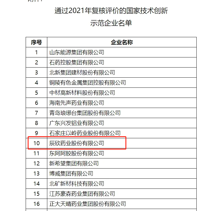 近日,根據工業和信息化部、財政部《技術創新示范企業認定管理辦法(試行)》(工信部聯科〔2010〕540號)和《工業和信息化部辦公廳關于開展2021年國家技術創新示范企業復核評價工作的通知》(工信廳科函〔2021〕93號)要求,工業和信息化部對2018年認定及通過復核的214家國家技術創新示范企業組織開展了復核評價,辰欣藥業順利通過“2021年國家技術創新示范企業”復核評價。