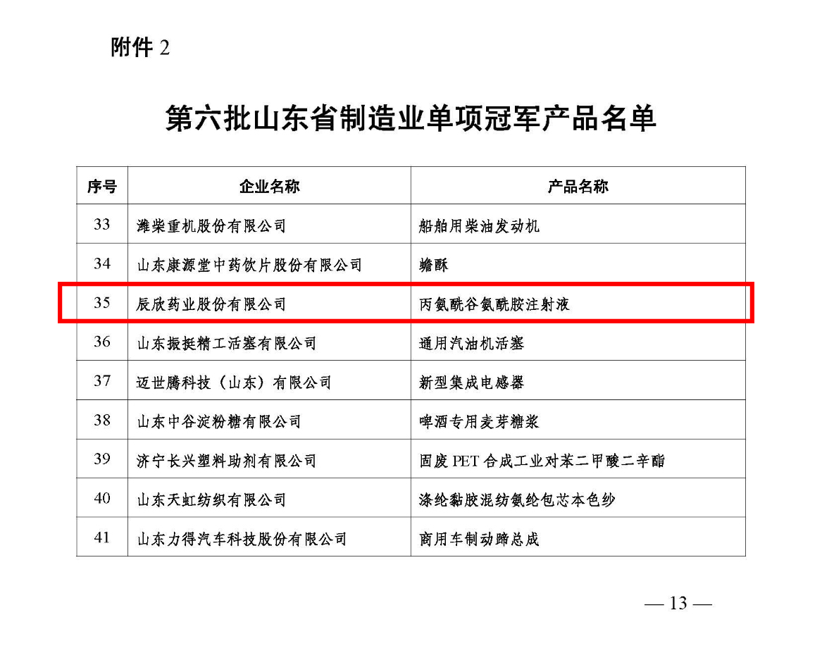 近日,山東省工業(yè)和信息化廳、山東省工業(yè)經(jīng)濟聯(lián)合會公布了第六批山東省制造業(yè)單項冠軍企業(yè)、單項冠軍產(chǎn)品名單。經(jīng)過限定性條件論證審核、行業(yè)審查、專家論證等環(huán)節(jié)、網(wǎng)上公示等程序,辰欣藥業(yè)“丙氨酰谷氨酰胺注射液”入選山東省制造業(yè)單項冠軍產(chǎn)品名單。